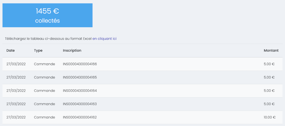 Cette page vous permet de faire un rapprochement comptable entre les inscriptions enregistrées, les commandes payées et le montant total que nous avons colecté pour vous.